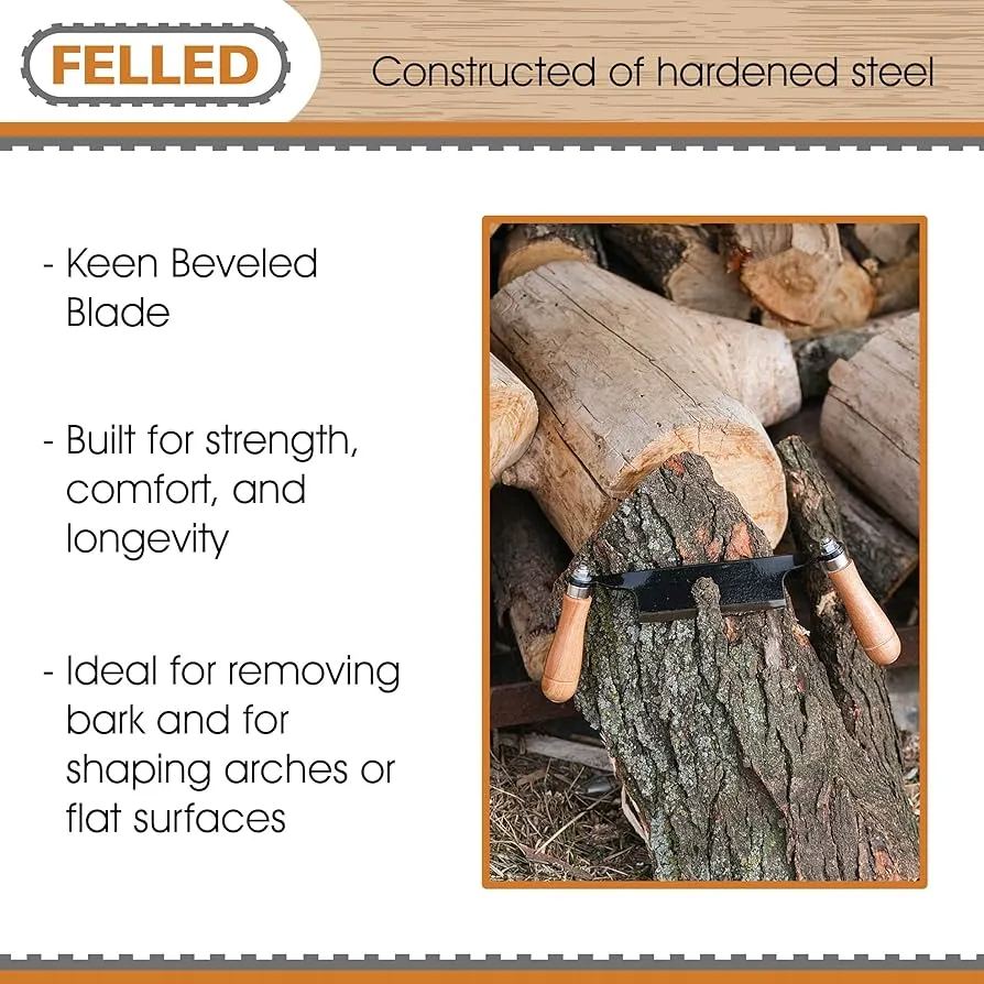 WOOD WORKING TOOLS FOR BUILDING FURNITURE: Rapidly remove wood and bark from logs, fence posts, and firewood with the Felled | 8 Inch Straight Wood Shaving Knife Draw Shave Wood Debarking Tool; Often used by timber framers, wood turners and carvers, and furniture fabricators these log draw knife woodworking hand tools quickly remove excess materials to shape surfaces to create spindles, pegs, seats, bowls, and much more.